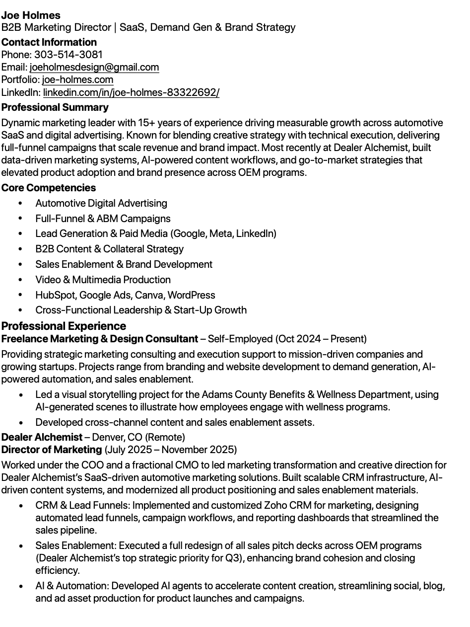 Worked under the COO and a fractional CMO to led marketing transformation and creative direction for Dealer Alchemist’s SaaS-driven automotive marketing solutions. Built scalable CRM infrastructure, AI-driven content systems, and modernized all product positioning and sales enablement materials.